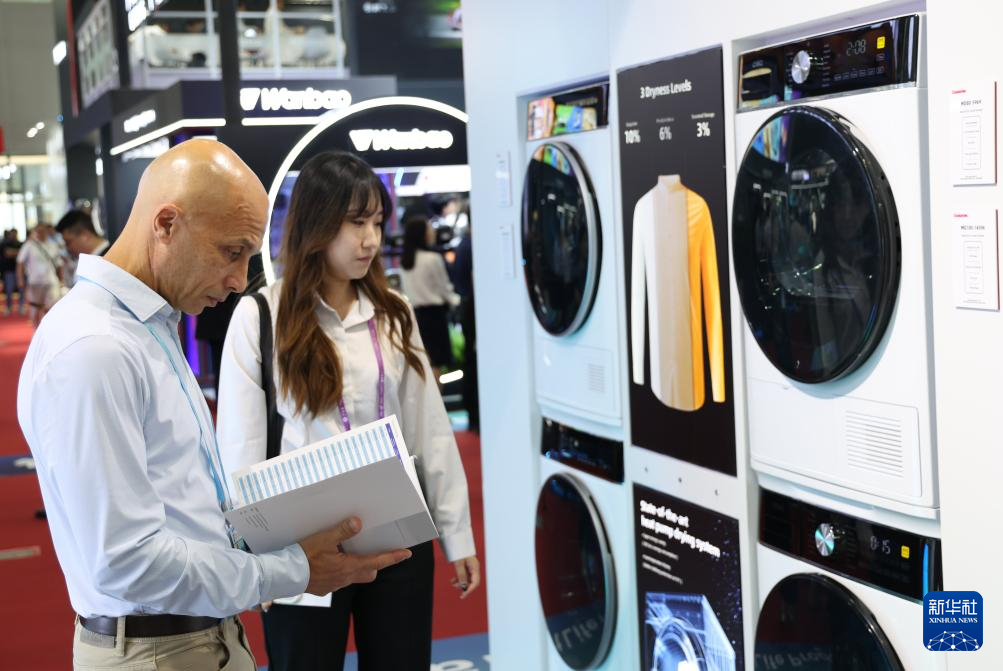 10月15日,客商在廣交會上咨詢了解智能洗衣機(jī)。新華社記者 盧漢欣 攝