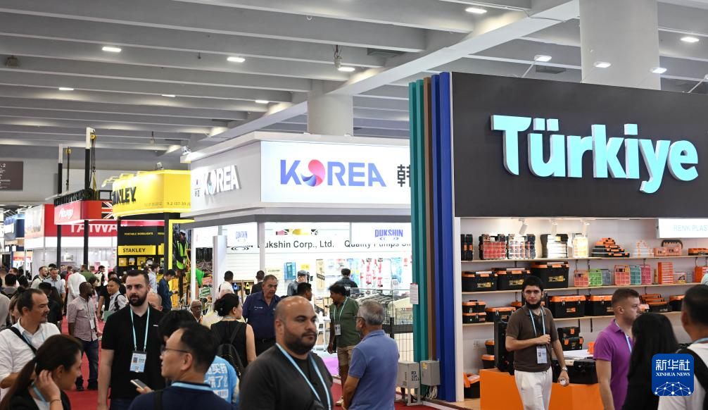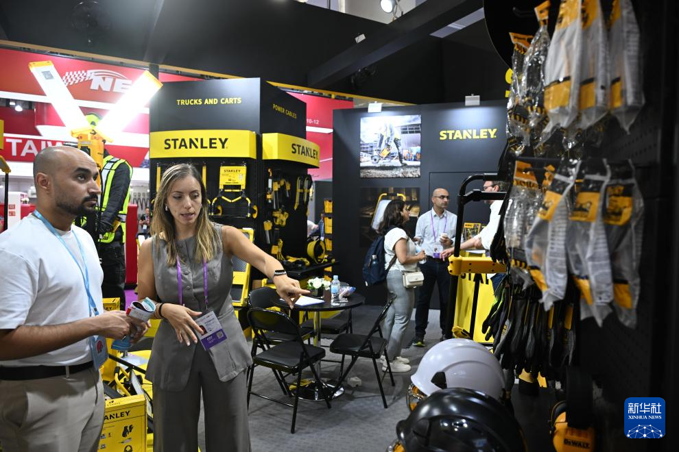 10月15日,在廣交會進(jìn)口展區(qū),境外采購商(左)在美國公司史丹利展區(qū)參觀。新華社記者 鄧華 攝