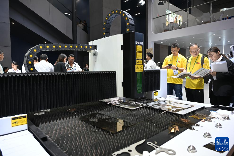 10月15日,境外采購商在激光切割機(jī)展臺前洽談。新華社記者 鄧華 攝
