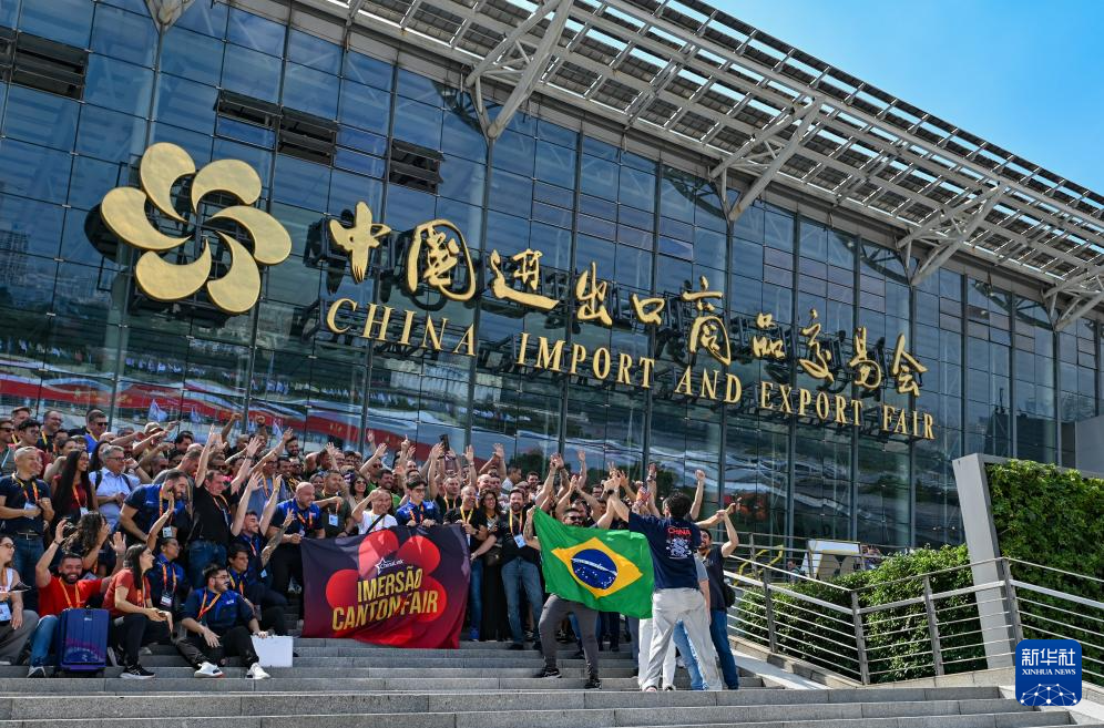 10月15日,客商團(tuán)體在廣交會門口合影留念。新華社記者 肖恩楠 攝