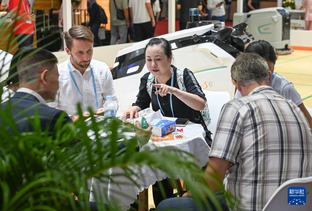 10月15日,展商在杜尼移動機(jī)器人展臺和客商交流。新華社記者 肖恩楠 攝