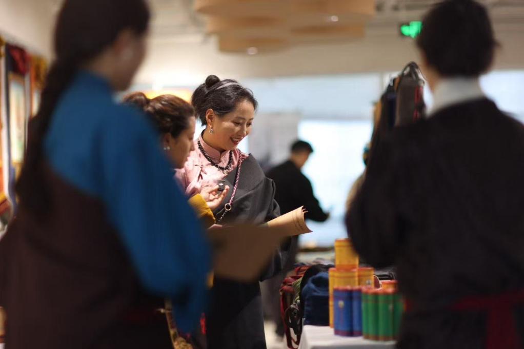在“麥宿手藝人&守藝人”成都巡展活動(dòng)現(xiàn)場(chǎng),達(dá)瓦卓瑪(左三)為參觀者介紹展品(10月24日攝)。新華社發(fā)