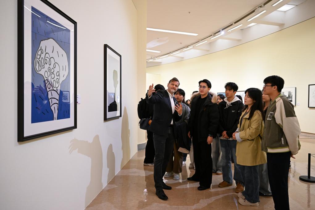 “第十一屆絲綢之路國際藝術節(jié)——今日絲綢之路國際美術邀請展”上,參展嘉賓(左一)為參觀者講解藝術作品。新華社記者鄒競一攝