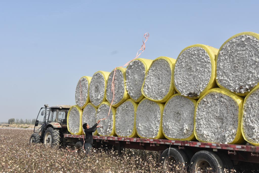 10月21日,在新疆阿克蘇地區(qū)沙雅縣的棉田中,棉農(nóng)在固定棉花包。新華社記者顧煜 攝